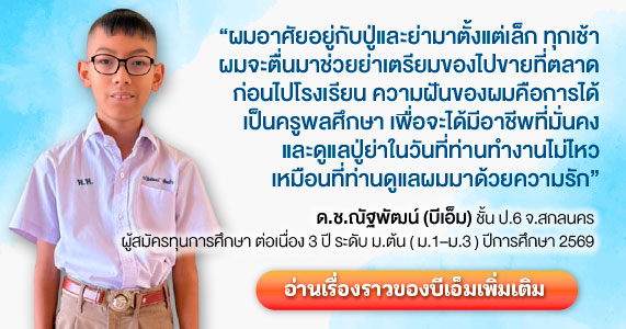 เด็กชายณัฐพัฒน์ (บีเอ็ม) ชั้น ป.6 จังหวัดสกลนคร ผู้มีความฝันอยากเป็นครู เพื่อดูแลปู่ย่าที่เลี้ยงดูเขามาตั้งแต่เด็ก