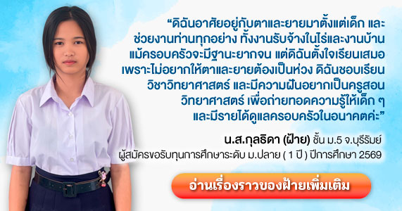 นางสาวกุลธิดา (ฝ้าย) ชั้น ม.5 จังหวัดบุรีรัมย์ เด็กสาวที่เติบโตมากับตายาย และมีความฝันอยากเป็นครูสอนวิทยาศาสตร์ในอนาคต
