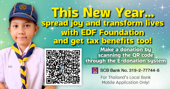 To supply donation details or fund transfer evidence, request a tax-deductible receipt, or for more information, please contact the EDF Foundation’s public relations department at 02-579-9209 to 11, email [email protected], or add us on Line: @edfthai