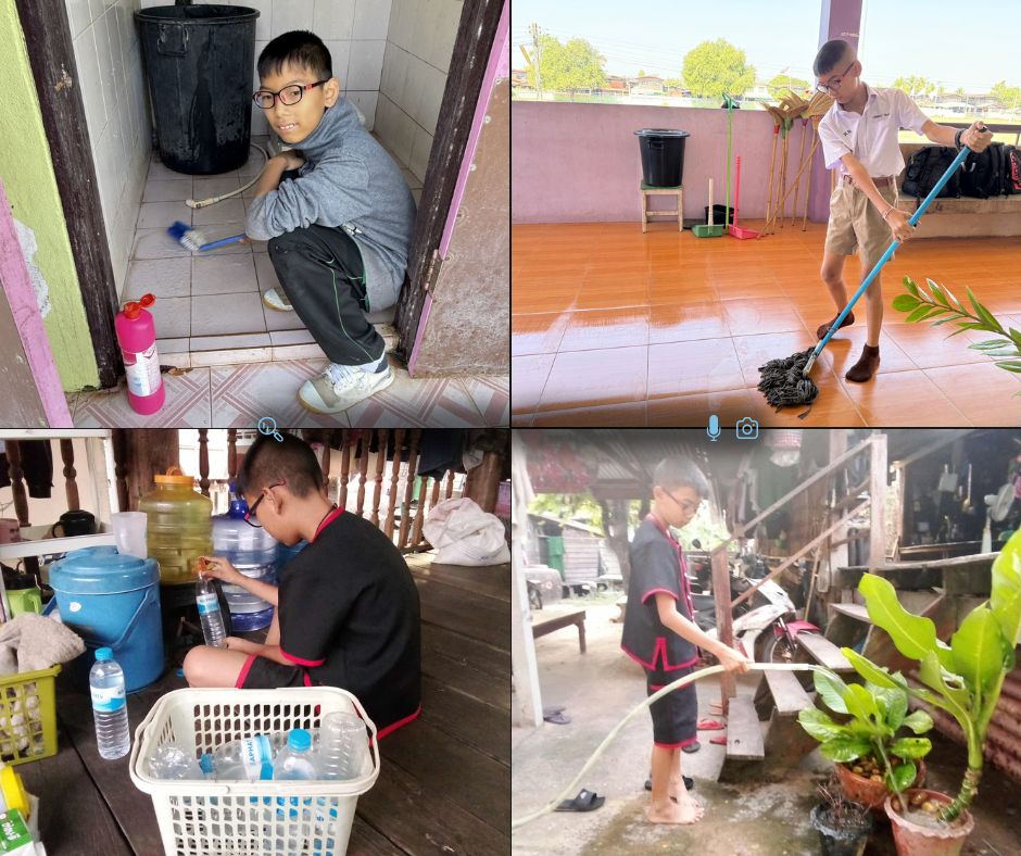 学校へ持っていくお小遣いは、1日20バーツ(約80〜90円)です。学校に着くとすぐにカバンを置き、担当の掃除当番をしたり、先生や友だちの手伝いをしたりしています。家族が僕を誇りに思ってくれるよう、勉強にも一生懸命頑張っています。放課後も、ペットボトルに水を入れることや掃除といった家事、そして翌朝のためのルークチン刺しの手伝いをして、二人の負担を少しでも減らせるよう努めています。