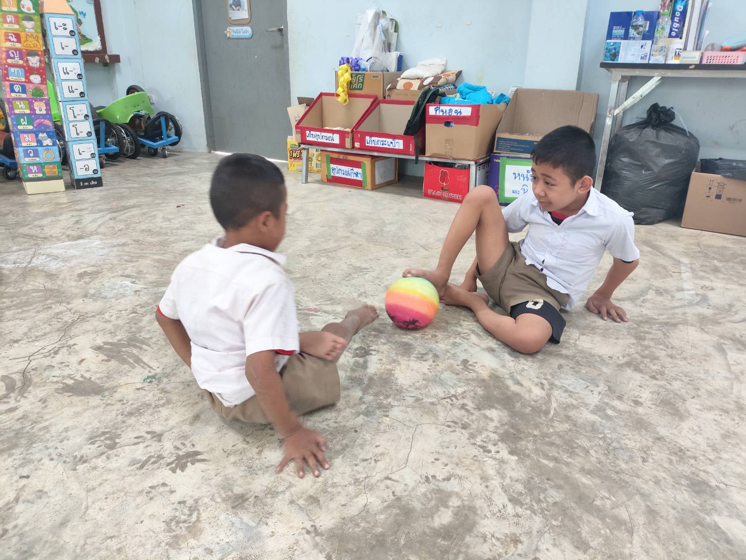 Although he was able to walk during kindergarten, an accident in Grade 1 caused a serious leg fracture. Since then, Kawin has been unable to walk and now uses his hands to move himself from place to place.
