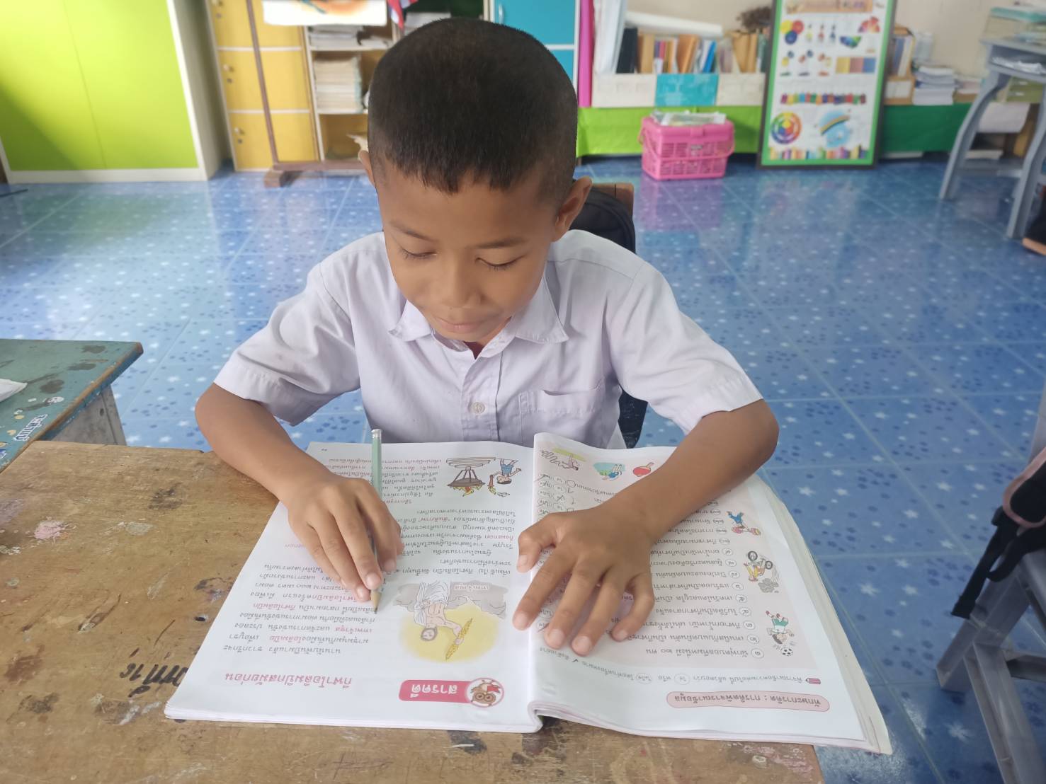 “Muhammad Faif, a Grade 3 student, studying in his classroom.”