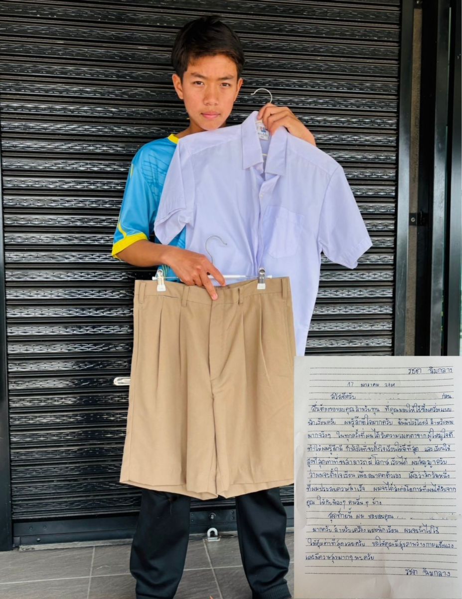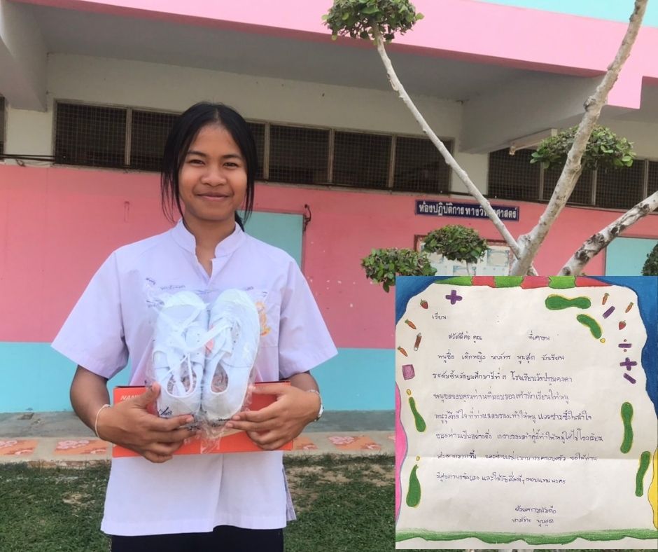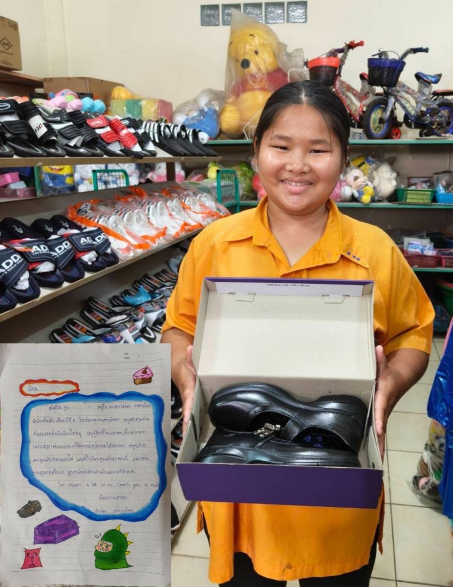 「こんにちは。私はラッダー・タートクラトークと申します。シュムションスワンウィッタヤー学校の中学3年生です。このたびは、学生用の靴を贈っていただき、本当にありがとうございました。とても嬉しく、深く感謝しております。いただいた靴は、私の家族の経済的な負担を軽減してくれる大きな助けとなりました。私は、この贈り物を大切に使い、しっかりと手入れをしていきたいと思います。そして、これからも一生懸命勉強し、立派な人間になるよう努力してまいります。支援者の皆様が健康で、愛と素晴らしい人々に囲まれて幸せな日々を送られることを心よりお祈り申し上げます。」