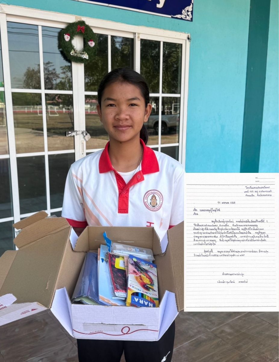 「 私はユパーラット・ターンカンと申します。現在、ノーンカーイ県ムアーン郡にあるハートカムボンワッタナー校の中学1年生です。このたびは、学用品という素晴らしい贈り物をお送りいただき、心より感謝申し上げます。とても嬉しく思っております。この贈り物は私の勉強にとても役立っております。私は、もっと努力して一生懸命勉強し、両親や先生の言うことをよく聞く良い子でいられるように頑張ります。また、いただいた学用品を大切に使い、最大限に活かしていきたいと思います。