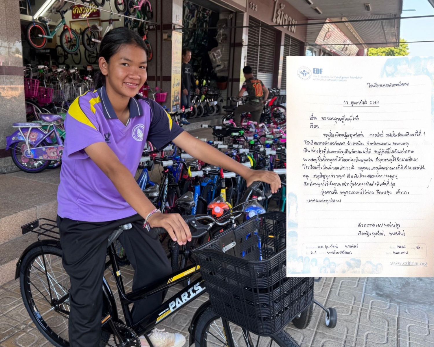 「私はユパーラット・ターナカンと申します。現在、ノーンカーイ県ムアン郡にあるハートカムボーンワッタナー校の中学1年生です。この度は、自転車という素敵なプレゼントをお送りいただき、誠にありがとうございました。私はとても嬉しく思っております。私はこれからこの自転車を使って毎日学校へ通うつもりです。私は兄の古い自転車を使っていましたので、新しい自転車をいただき、本当に感謝しています。支援者様に心よりお礼申し上げます。私は家族や先生の言うことをよく聞き、良い子でいるよう努力いたします。そして、この自転車を大切に使い、有効に活用させていただきます。
