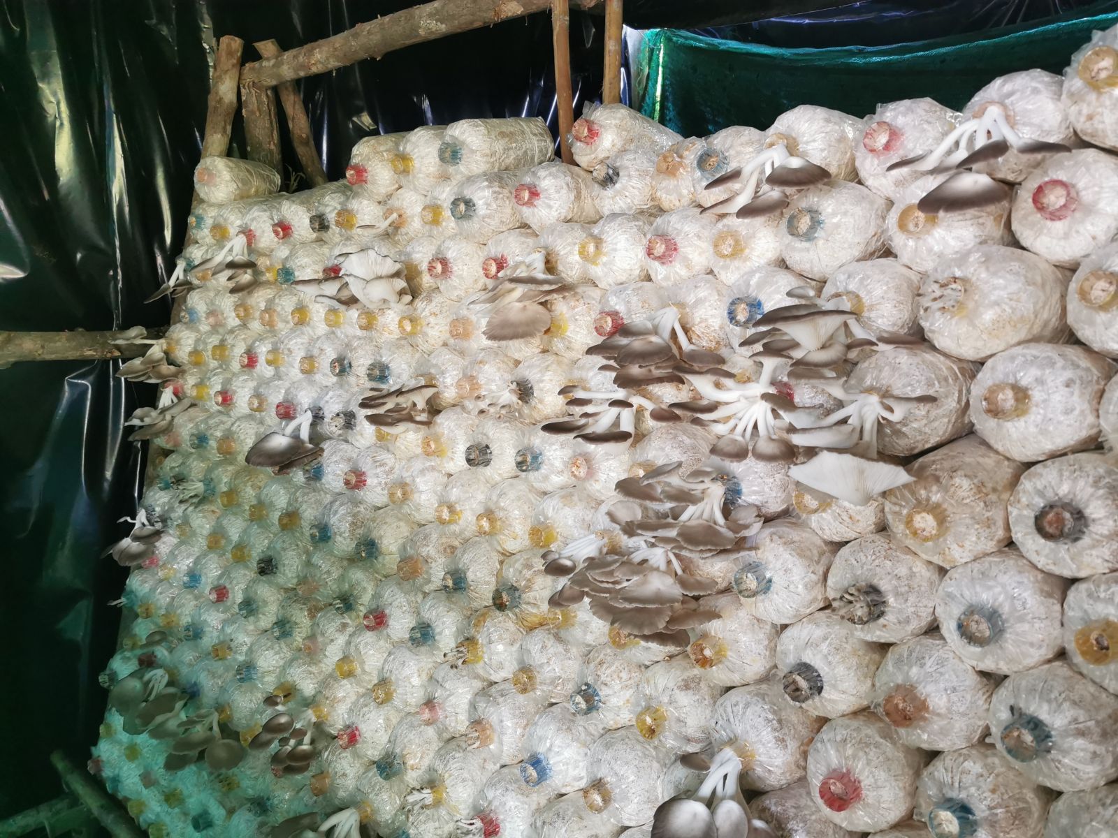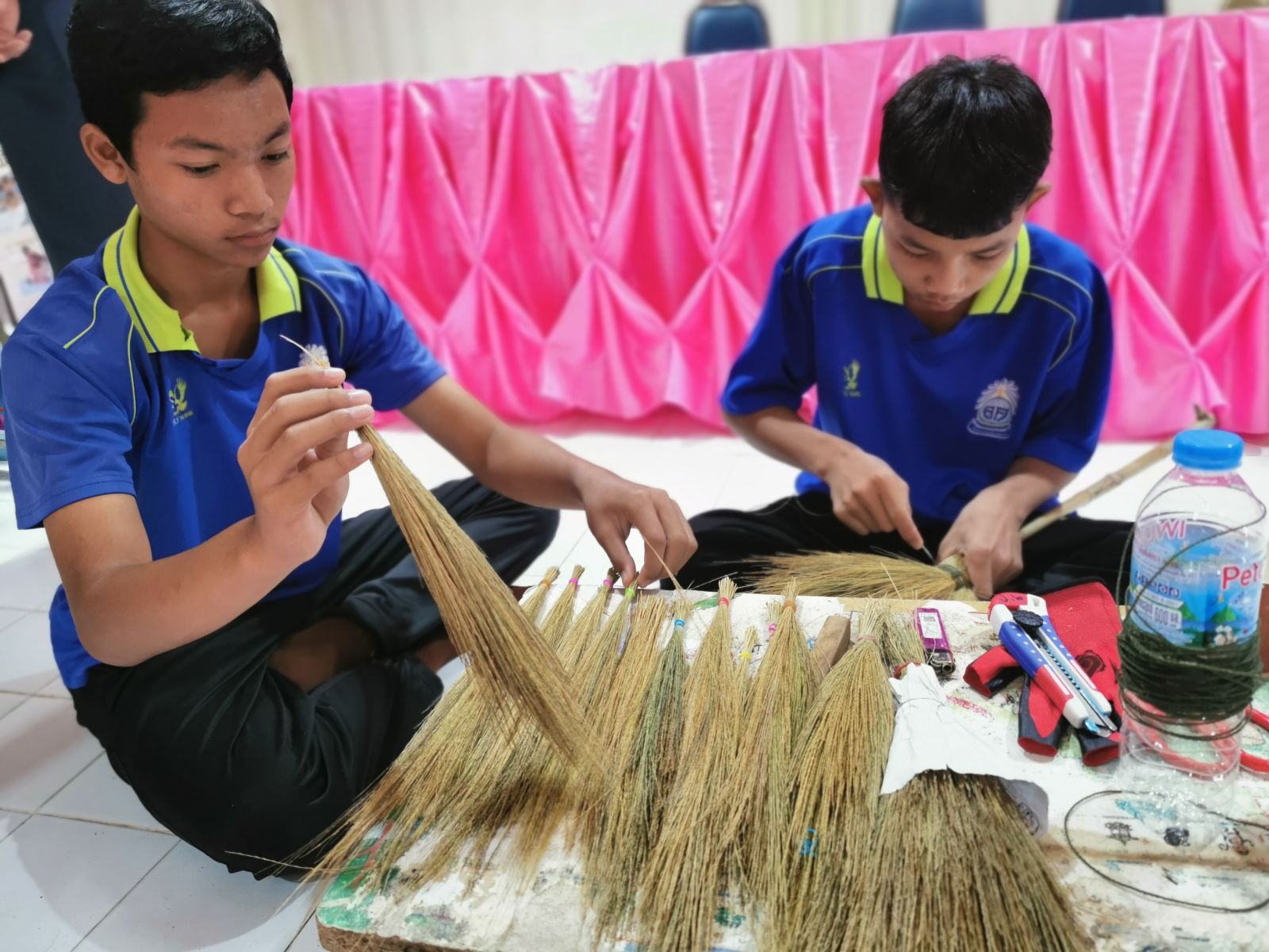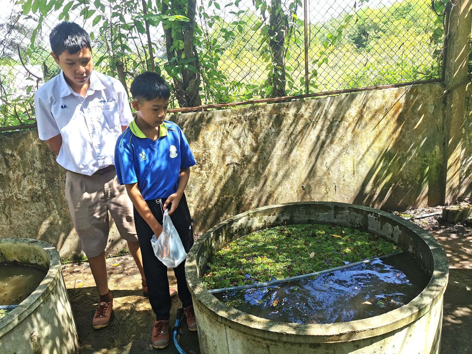 (2)ムクダハーン県、バーンノーンサンシー学校: 収入創出のための職業訓練プロジェクトとして、ヒラタケ栽培、セメントで囲われた養殖場でのナマズ養殖、草ほうき作りなどを実施。